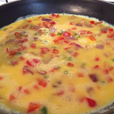 Heat the garlic, peppers, and onion in a large skillet with one teaspoon of olive oil until fragrant, and then add the egg mixture into the pan. Scramble the veggies and the egg together.